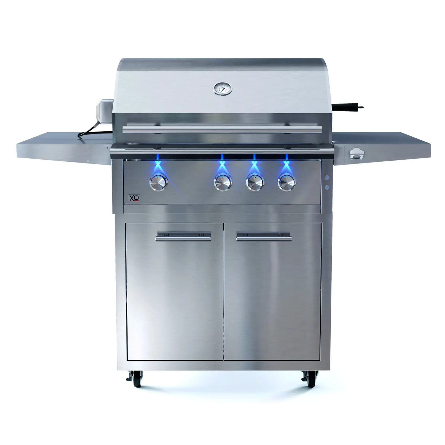 Your XO Freestanding 36 inch grill is the heart of your outdoor kitchen. Available for use with either natural gas or propane, this Pro-Grade luxury grill comes with 3 distinct cooking zones. Powered by three cast 304 stainless steel burners and one infrared variable ceramic burner ready to simmer or sear with a twist of a knob. Use your grill day or night with Blue LED lit knobs and internal halogen illumination. XO Grills also come with a secondary rack for indirect cooking that holds a 1/4 baking sheet and flips up out of the way when not in use as well as an infrared rotisserie burner for indirect cooking with a 25 lb. capacity Pro Grade waterproof motor and spit.